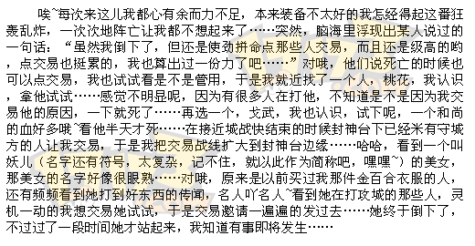 “是哦,你的装备好好哟,你不垃圾,别人都垃圾~”我说着(眼睛斜视对方);