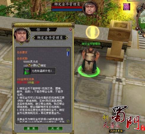 玩家可以在成都、天化村、雪山村等主要城镇与NPC【绑定金币管理员】对话领取绑定金币任务。(任务为每日1次,任意等级均可领取并完成)。完成金币绑定任务不但可以获得额外10%的金币奖励,更有大量灵力和七色钛晶碎片等物质奖励。绑定的越多,得到的额外奖励也越丰厚!
