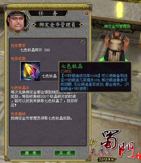 除了完成任务获得的额外金币和灵力奖励以外,只要集齐200个通过绑定金币任务获得的七色钛晶碎片,即可兑换一个七色钛晶石,七色钛晶石可以在锻造+7装备法宝时增加10%的成功率哦 !(最多一共可以放4个)能使自己的账号更加安全同时又能获得那么丰厚的奖励,何乐而不为呢?