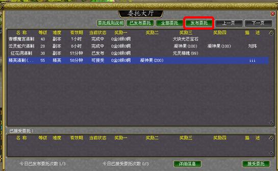 2、人物角色只能够将自身任务列表中符合发布条件的任务发布。(目前能够通过委托任务发布的任务主要为帮会任务(剑仙台发布),【委托任务管理员】处发布的任务。)