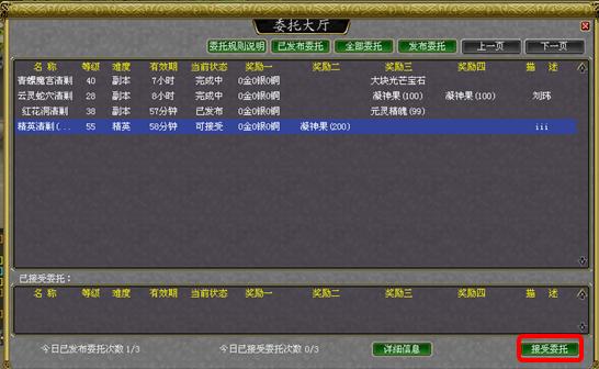 2、接受委托任务后不能放弃,完成任务后奖励会通过邮件邮寄给完成任务的角色。