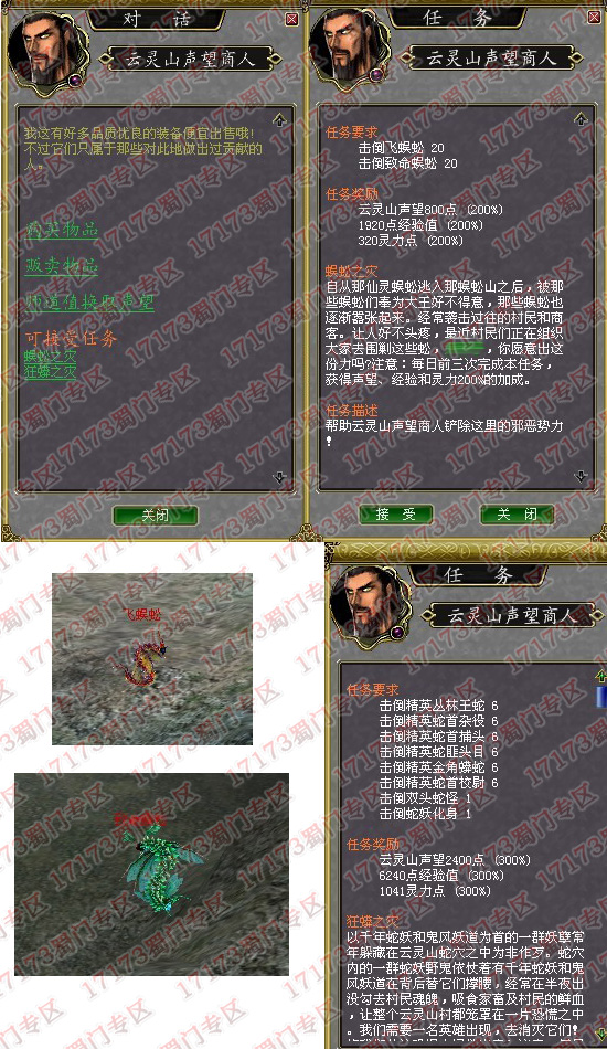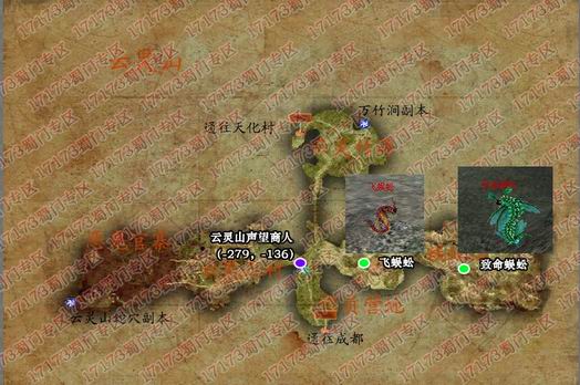天化村云灵山虎爪山成都城黑风寨雪山村桂花山 点击图片查看原图任务地点:云灵山接任NPC:云灵山声望商人(伤员营地279,-136)在云灵山,要到达天人至尊所需的总声望值:25000任务名称:蜈蚣之灾任务奖励:声望值800点、奖励经验1920点、奖励灵力320点(任务奖励每天前三次