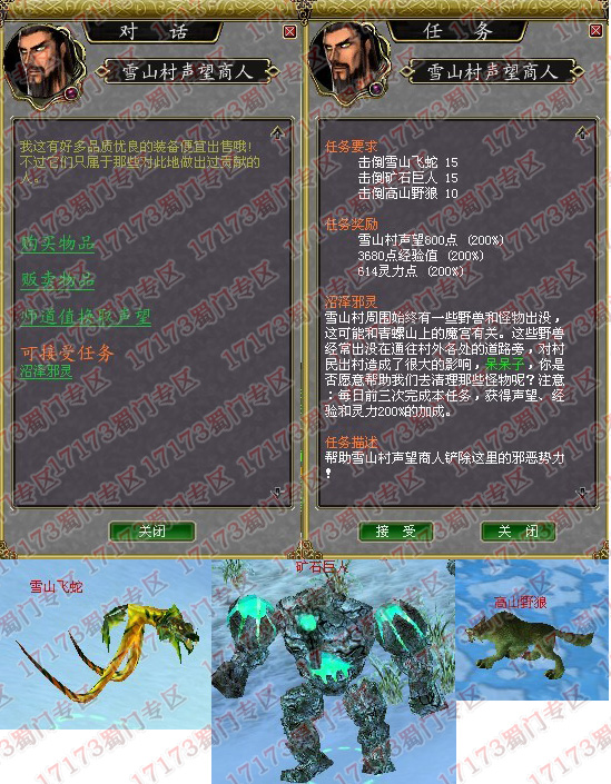 接任NPC:雪山村声望商人(雪山村落-1137,-975)
