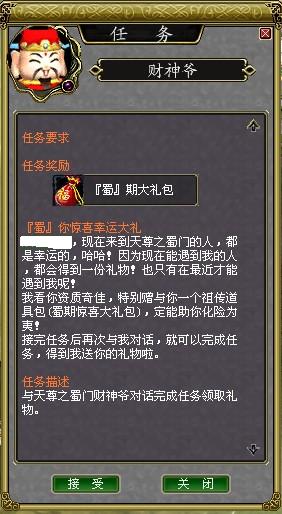 蜀门中只要完成任务就可以免费获得蓝法宝和蓝鉴定,以下是任务详解:1.蓝法宝任务NPC:知客了一位置:黑风寨所需等级:28级文章分页目录加入收藏进入游戏论坛复制链接地址任务NPC:被困的举子位置:黑风寨副本内2.蓝色鉴定宝石以下内容需要回复才能看到任务NPC:张家小道士位置: