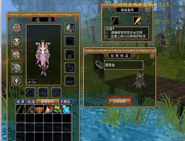 第五步:在鱼的咬钩时间内点击鱼漂,出现【拾取物品】界面,单击【全部拾取】按钮,可以获得垂钓成果,同时增加钓鱼熟练程度